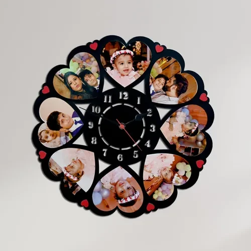 wooden clock with printed hearts shape photos on it gives fabulous look to your